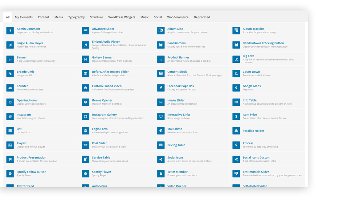 A boosted version of WPBakery Page Builder included ([wolf_core_vc_price] value) with a clean admin design and a ton of additional elements for musicians.