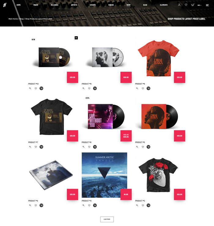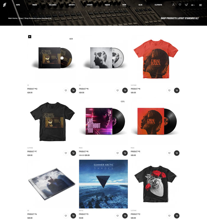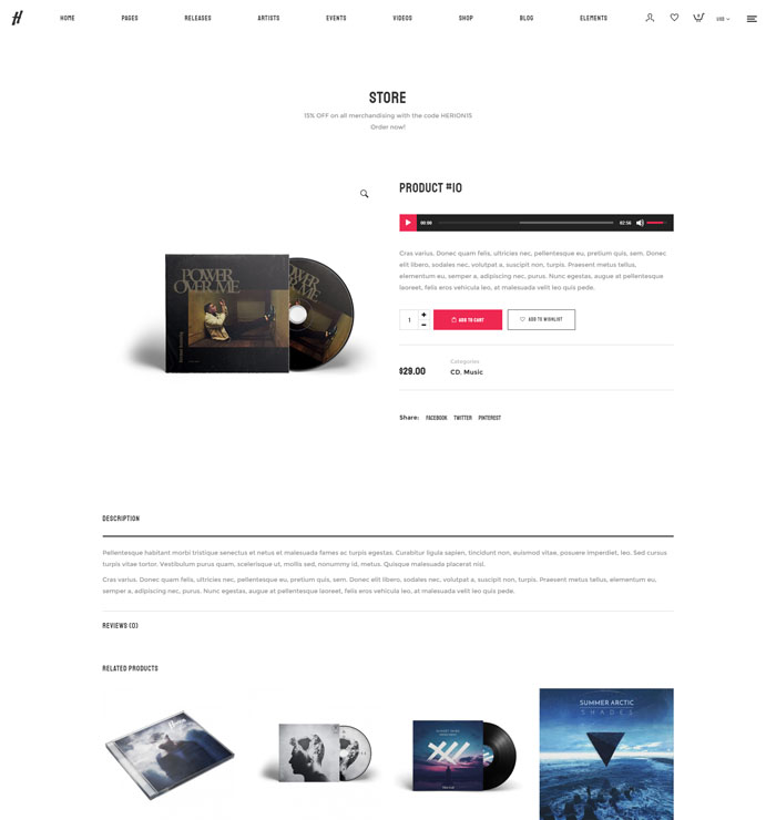 Herion can be used for your record label website. You can create an unlimited number of pages for each artist and choose between simple default layouts, automatically generated from the release, videos and events artist category, or create a custom page. It’s all up-to-you!